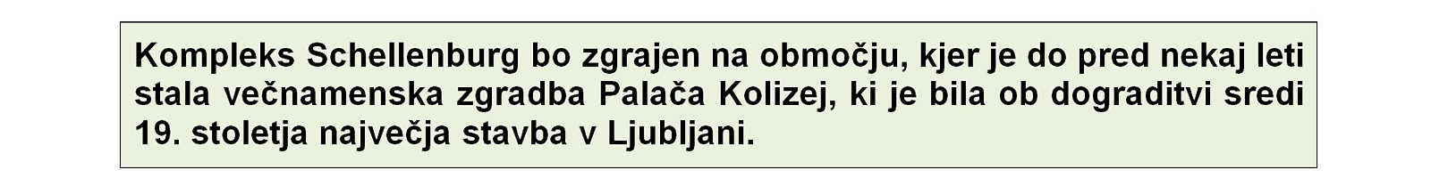 Kompleks Schellenburg je sestavljen iz dveh objektov: večje zgradbe Palais, ki sledi ritmu oblikovnega jezika pripadajočega poslovnega objekta, in manjše Ville, ki odraža značaj suverenega osamelca. Zgradbi sta zamišljeni kot dialog dveh nasprotujočih arhitekturnih slogov, obema pa so skupna visoka pričakovanja glede bivanja. Razkošna stanovanja, vseh bo 125, bodo vrhunske izvedbe ter umetniške dovršenosti, tako da investitor obljublja, da bodo na novo opredelila kulturo bivanja v Ljubljani. Skupna vrednost projekta je približno 90 milijonov evrov.