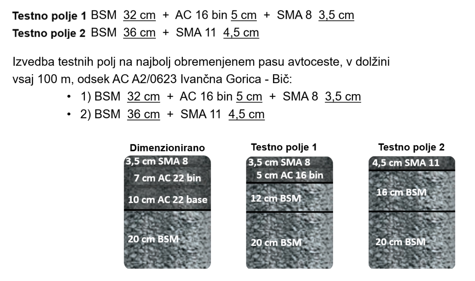 Trenutno se izvaja obnova avtocestnega odseka A2 0023/0623 Ivančna Gorica – Bič. Na delu odseka od km 4,160 do km 4,900 se bo v drugi polovici junija vgrajevalo tudi plast BSM. Dne 22. 3. 2023 je bil podjetju DARS posredovan predlog izvedbe dveh testnih polj (slika 3) (vsak v dolžini vsaj 100 m), vendar je bil v celoti zavrnjen.